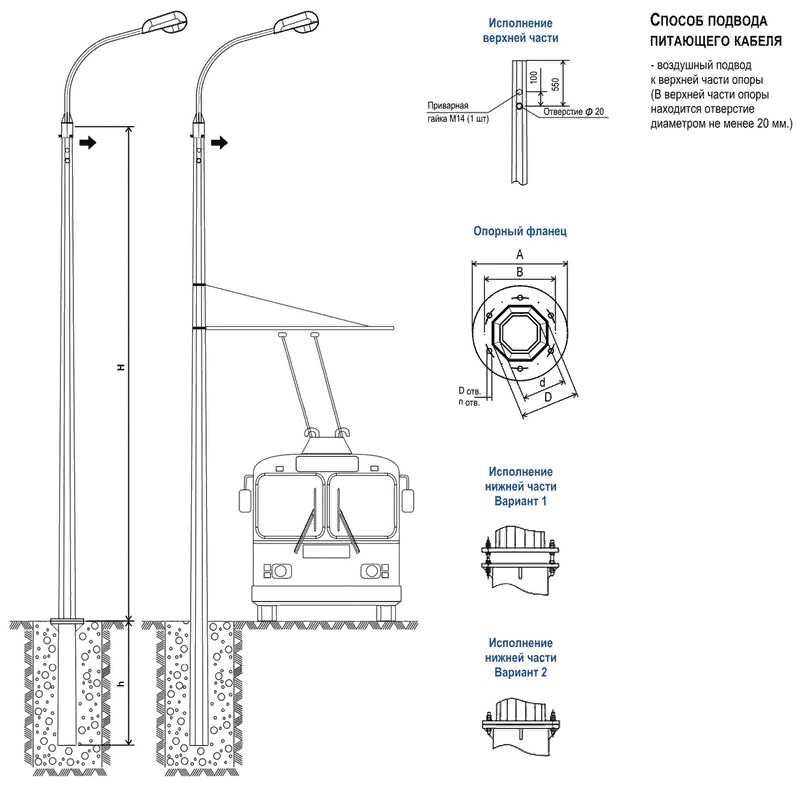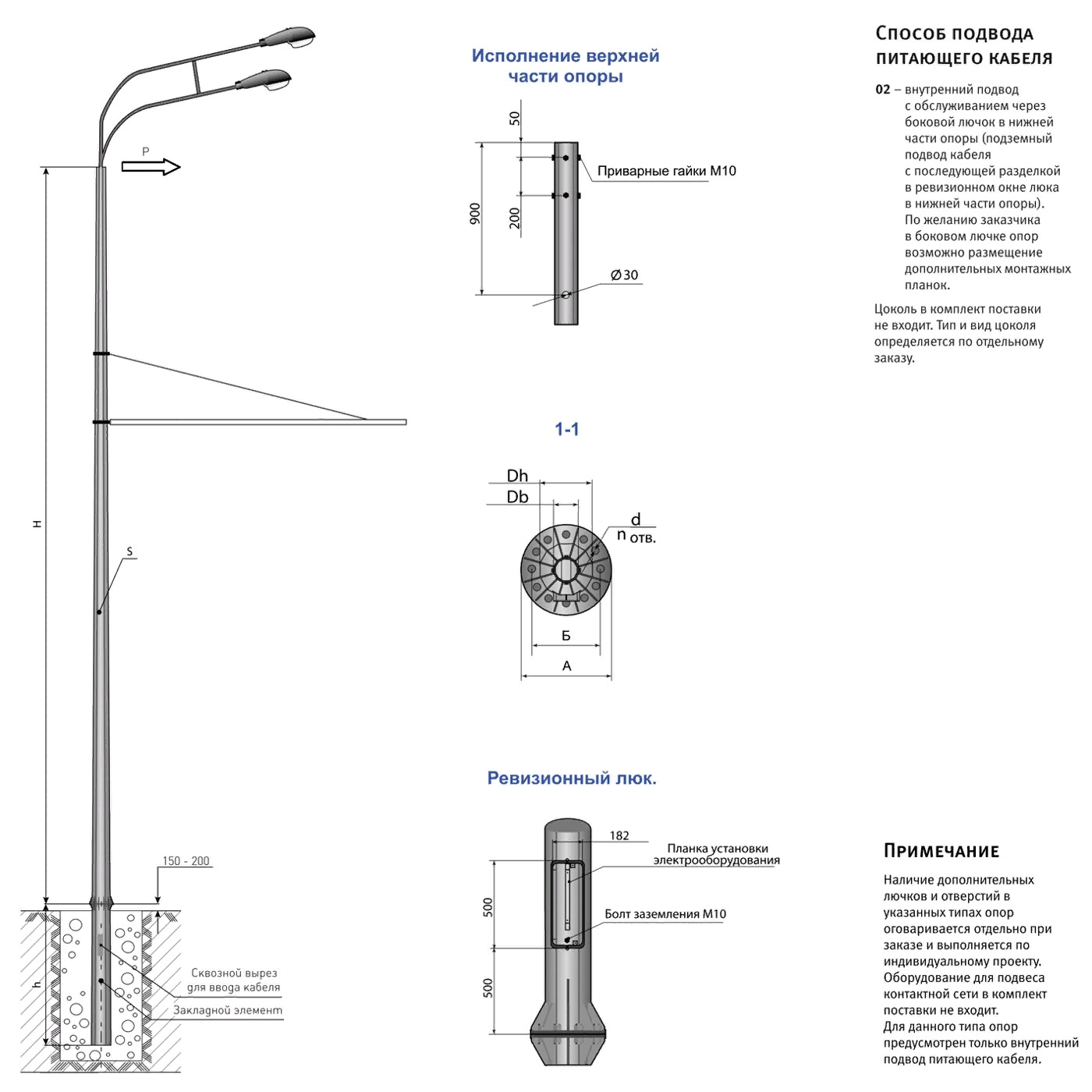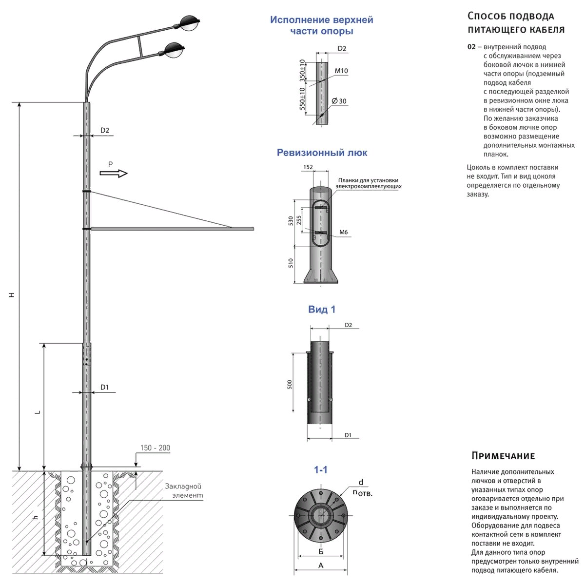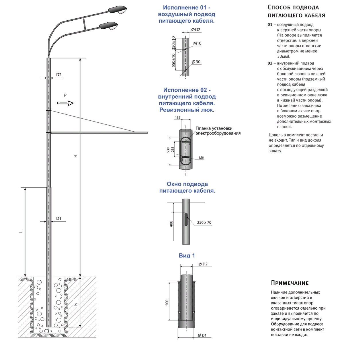 Подвод электрокабеля к опорам выполняется воздушным и подземным способом. Во втором случае разделка кабеля осуществляется в ревизионном окне люка, который располагается в нижней части опоры. При изготовлении конструкций под заказ возможно проектирование опор с дополнительными лючками и отверстиями.