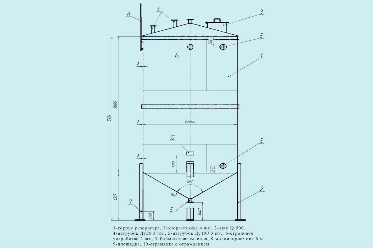 Установленная на опоры емкость представляет собой металлическую напорную башню высотой 4500 мм, что в большинстве случаев позволяет отказаться от использования погружного насосного оборудования. Основные конструкции резервуара: